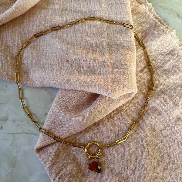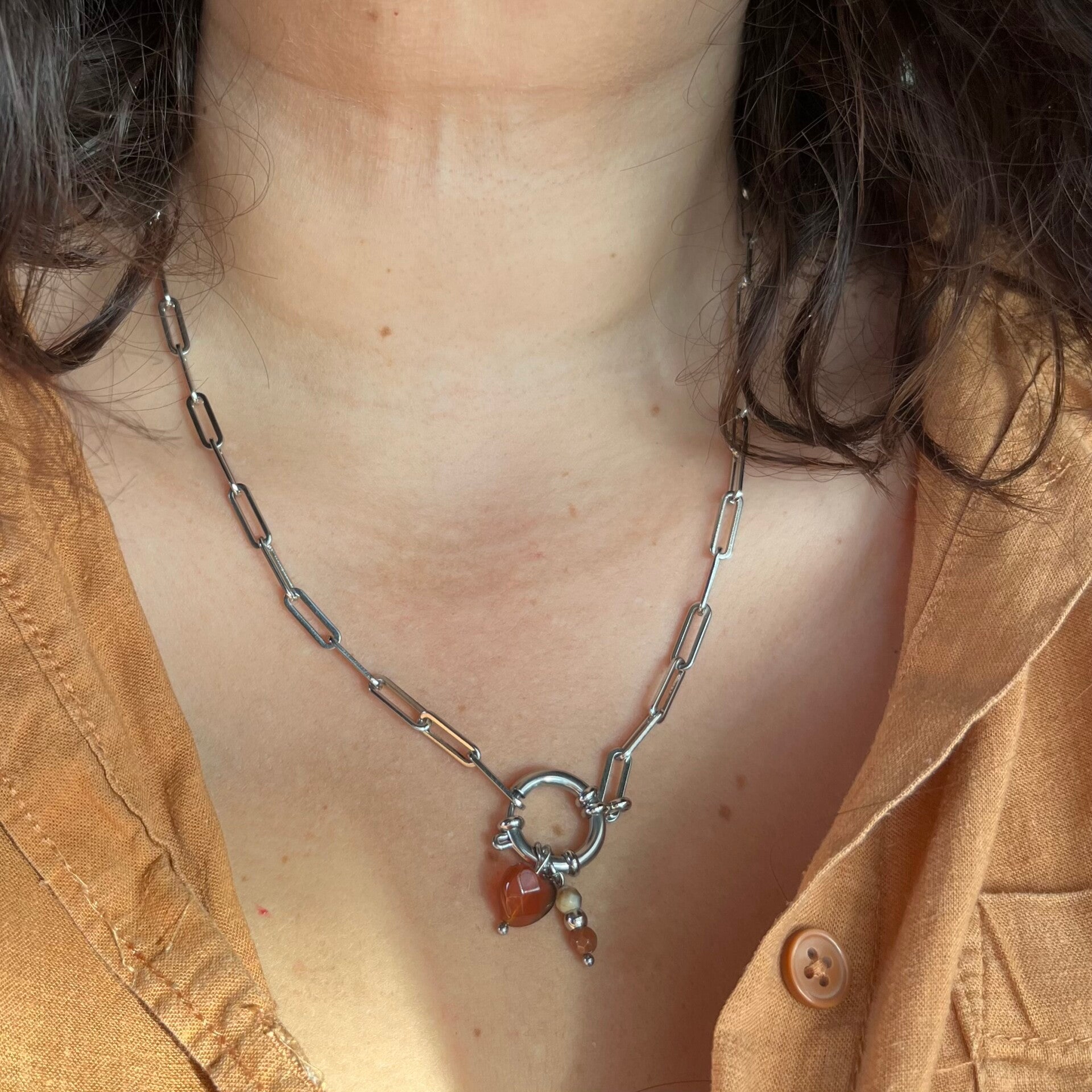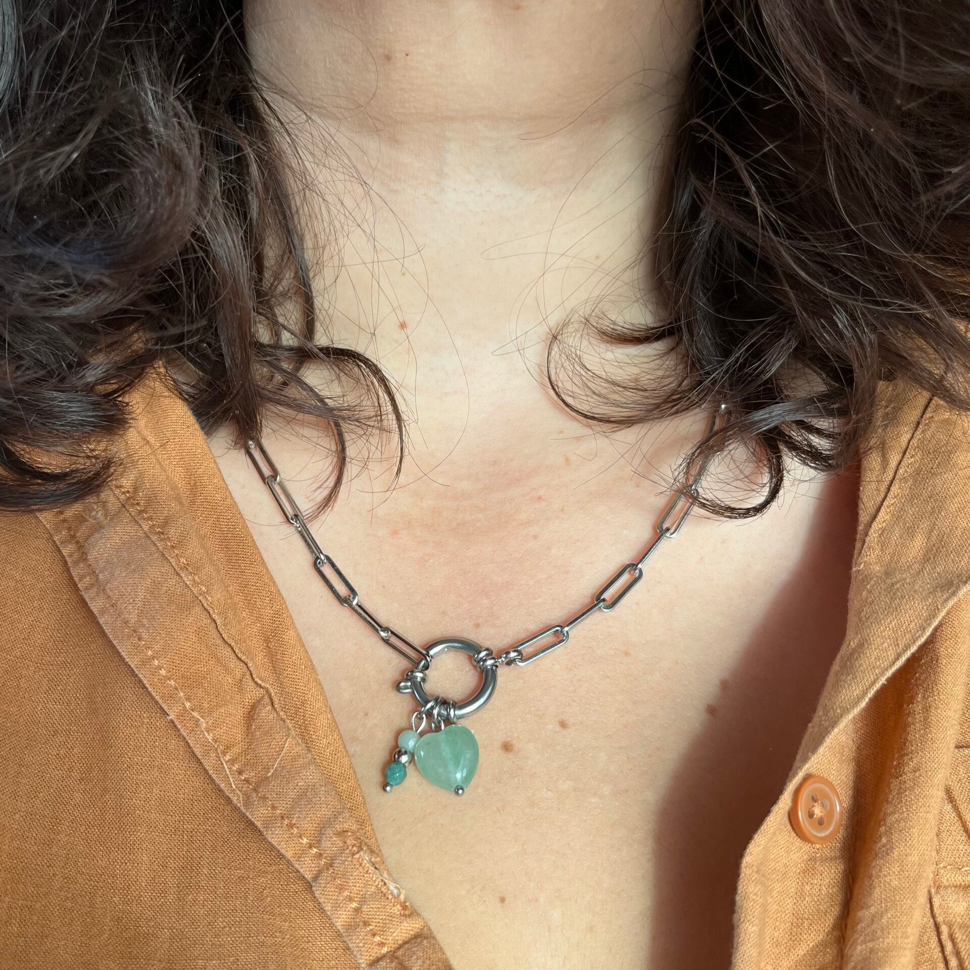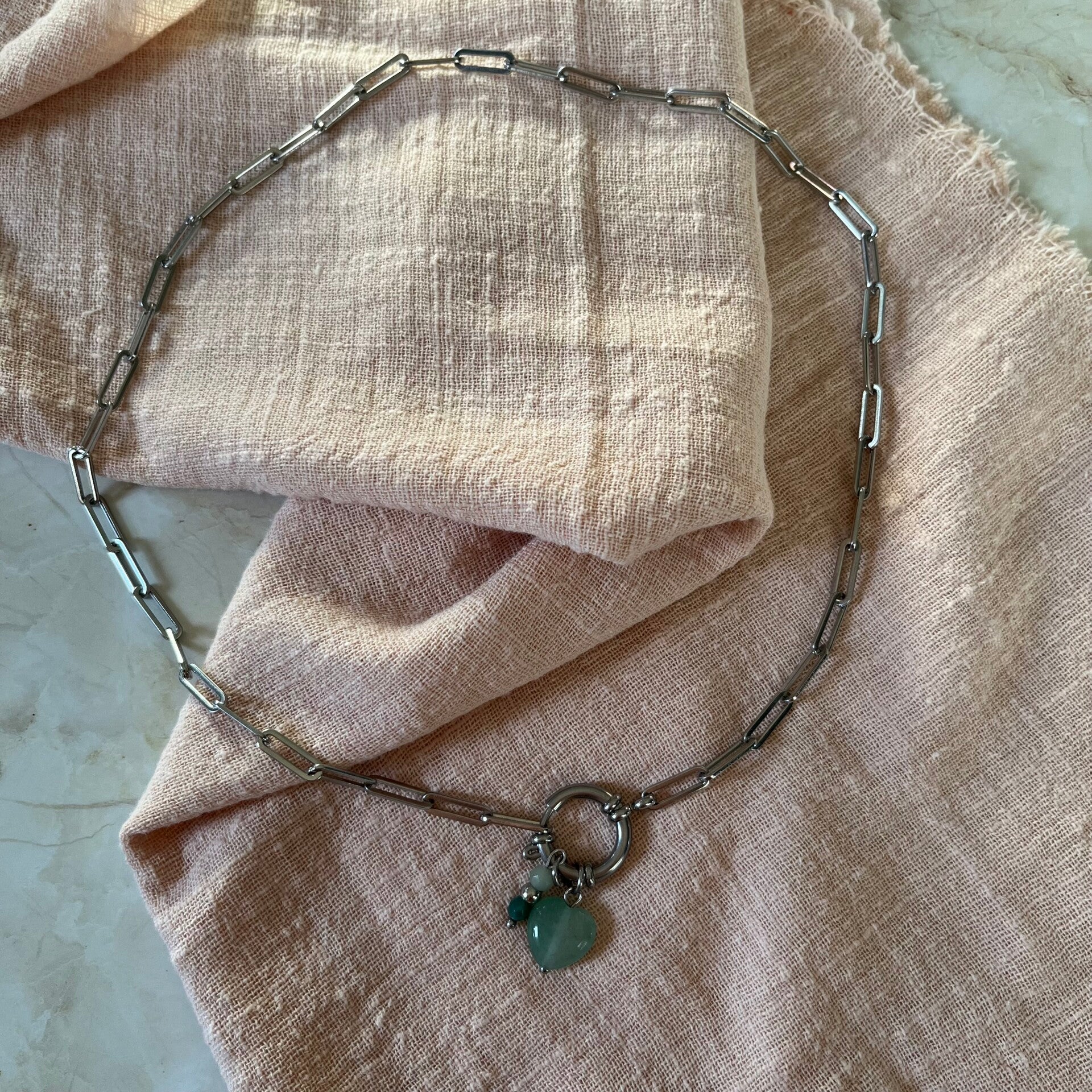 Deze roestvrijstalen ketting in zilver of goud maak je aan de voorkant vast met een grote boeislot. Hieraan hangt een natuurstenen hartjes hanger met een extra natuurstenen kralenhangertje.