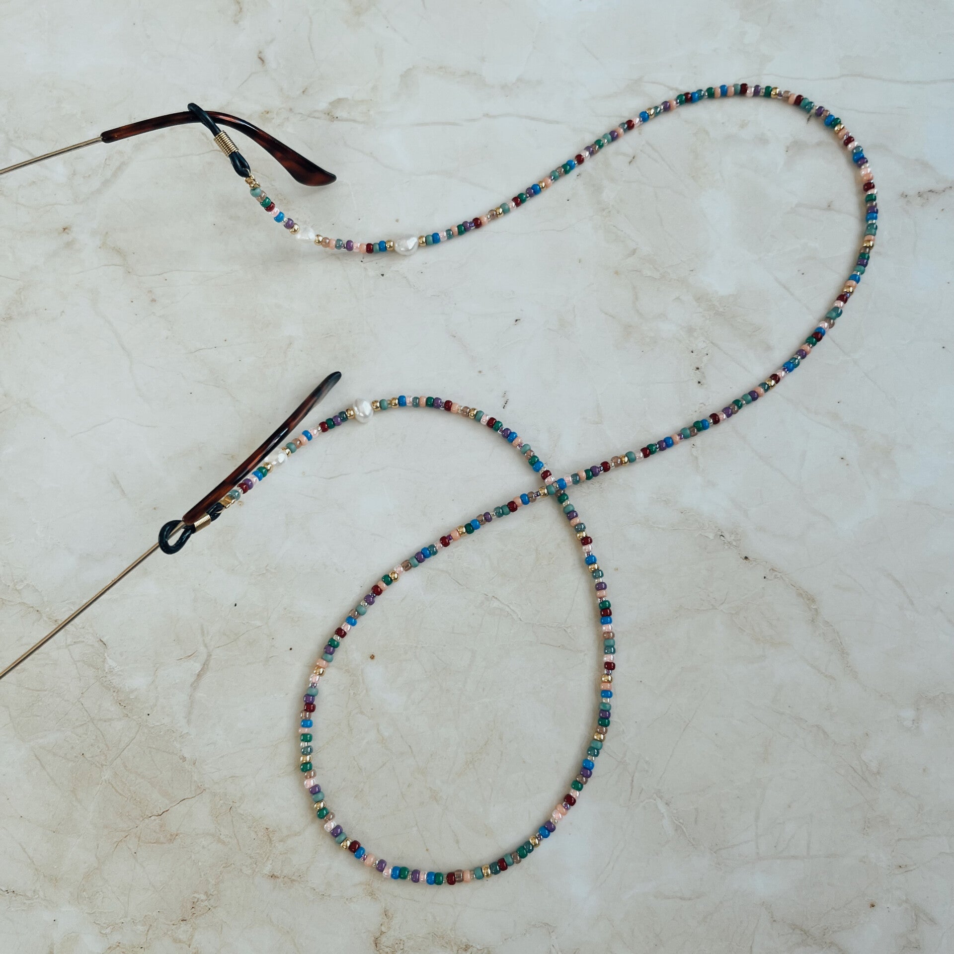Zonnebrilkoord gemaakt met miyuki (kleurvaste) kraaltjes, en zoetwaterparels.